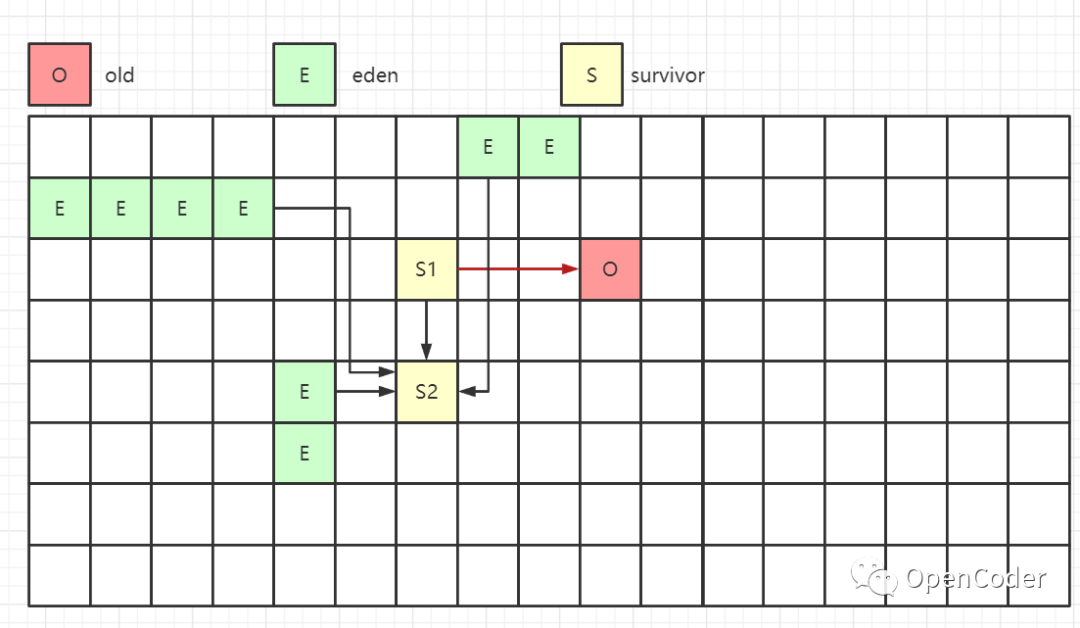 所以经过一段时间新生代的使用和垃圾回收后,总有一些对象会进入老年代,如下图: