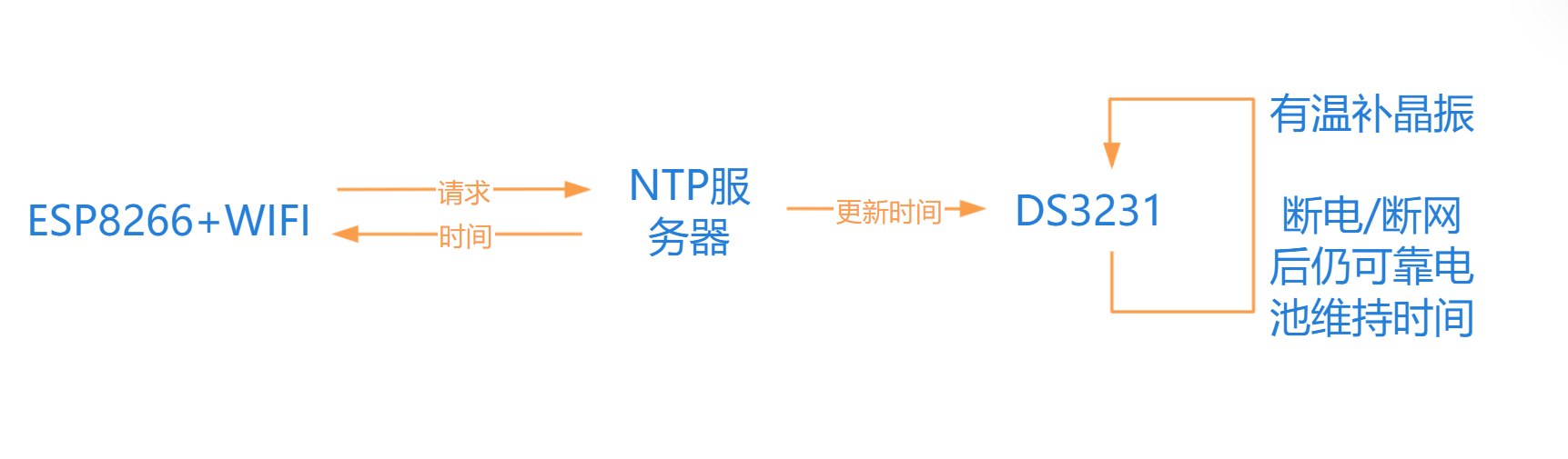 在ESP8266项目中,应该是在连接Wi-Fi后,向NTP服务器发送请求,获取当前时间,然后调整本地时钟模块(比如DS3231)的时间。