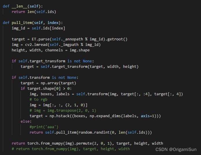 ssd.py中修改32行num_classes以及改变pull_item函数如下(解决img, boxes, labels = self.transform(img, target[:, :4], target[:, 4])这行报错,target可能为空):