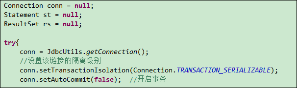 如果是使用JDBC对数据库的事务设置隔离级别的话,也应该是在调用Connection对象的setAutoCommit(false)方法之前。调用Connection对象的setTransactionIsolation(level)即可设置当前链接的隔离级别,至于参数level,可以使用Connection对象的字段: