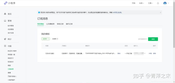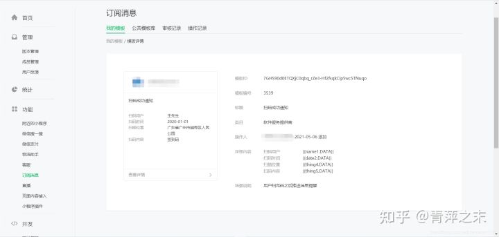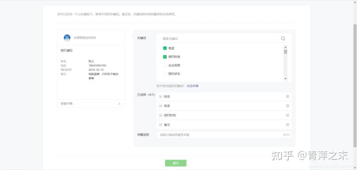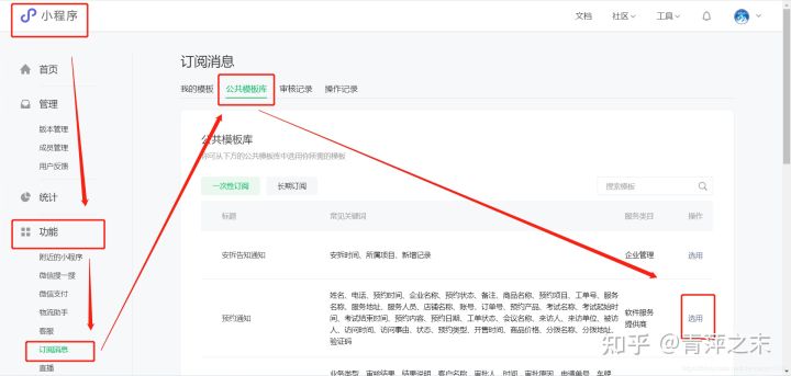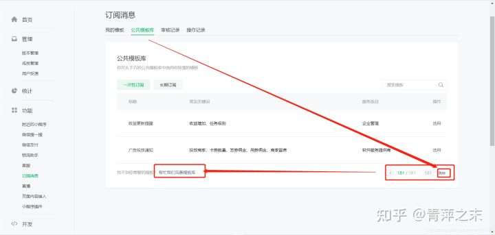 - 登录微信公众平台后台,点击功能》订阅消息(若之前没有使用过,则点击开通) - 点击公共模板库 的title,可以看到 有很多模板,可以点击搜索选取适合自己的模板 - 选到心仪的模板后,点击选用 - 选用之后,可以看到模板有很多关键词,这些关键词可以选择性取用,比如上图我只选择了4个关键词,关键词不够可以申请 - 关键词选用完毕之后,填写场景说明,点击提交,就可以了看到这个模板已经出现在了我的模板库中