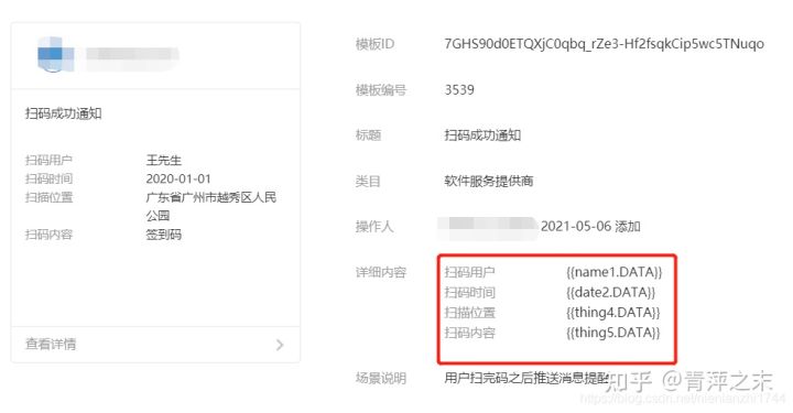 - 我们点击详情,就可以看到模板具体的信息,其中发送消息最重要的参数我们在这个页面可以看到 - 一个是:模板ID。模板id决定了发送消息时选用哪个模板 - 一个是:详细内容。详细内容就是要往模板中要塞哪些参数,比如上面这个模板的参数就有4个,name1、date2、thing4、thing5。这4个参数就相当于实体的属性一样,在下面的文章中我还会介绍到,暂且不表。