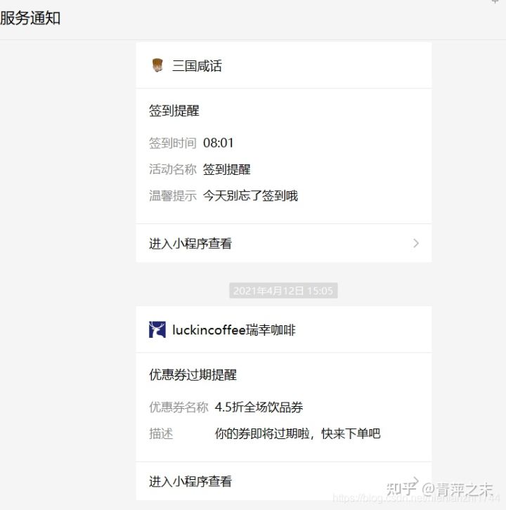 在微信小程序中进行了某种操作后,推送消息告知用户的操作结果。或者微信端办公流程提交给下一个人审批后,得到审批通过或是驳回修改的命令 - 使用场景具体如下图,可用在签到、提醒、通知、警告、催办等方面: