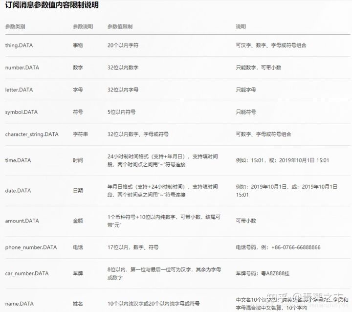 - 在微信公众平台的消息订阅中找到消息模板,找到具体有哪些参数。如下图所示,我们可以看到该模板有name1、date2、thing4、thing5四个参数(后面的DATA不用管)