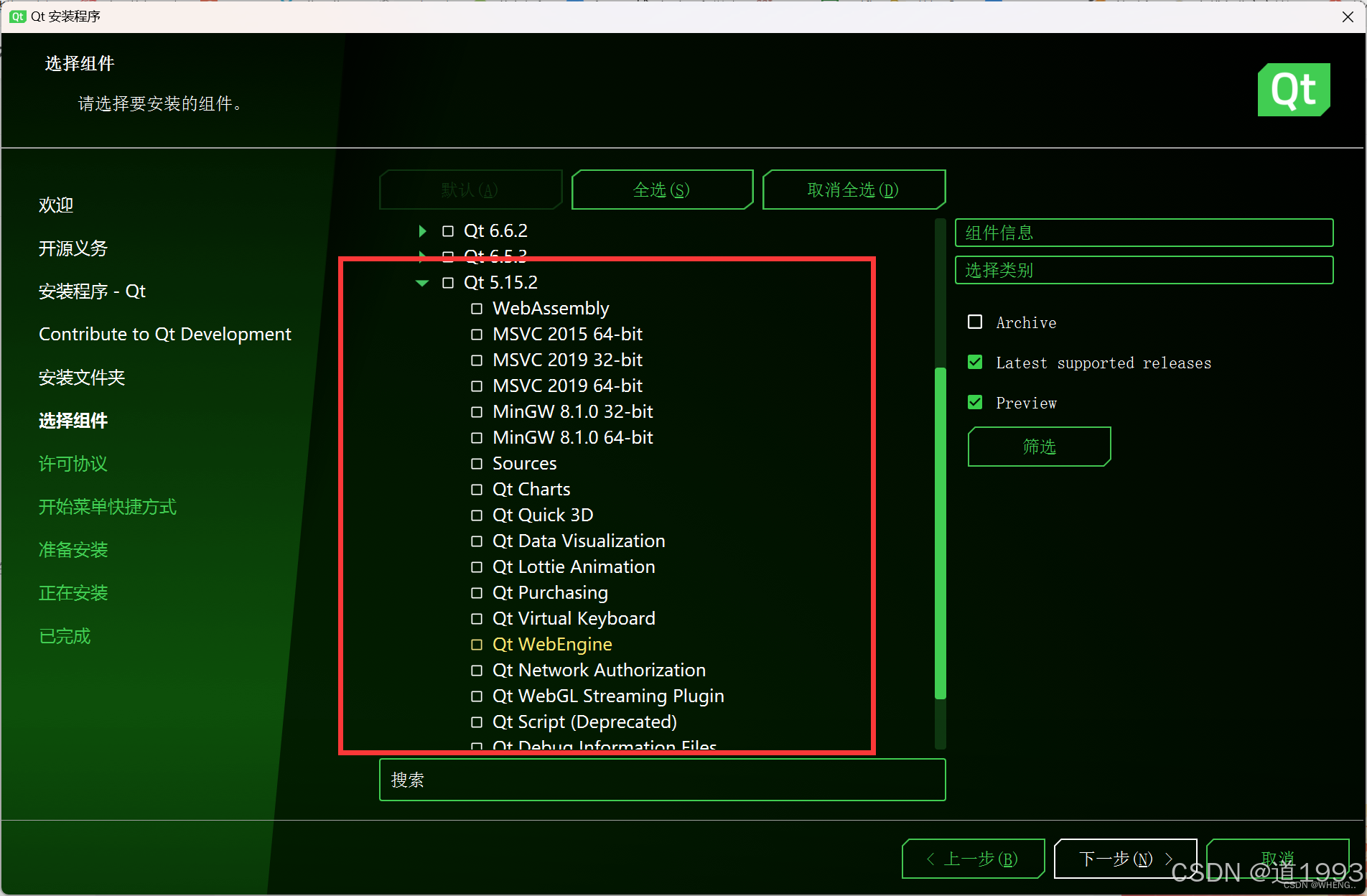 Qt ***:Qt的附加模块,由于占用空间不大,大部分建议安装。其中的 TP 是指 Technology Preview,技术预览模块的意思;Deprecated是指抛弃的旧模块,除非为了兼容旧版本,一般用不到。