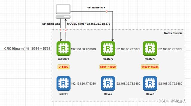 Redis集群中引入了哈希槽的概念,Redis集群有16384个哈希槽,进行set操作时,每个key会通过CRC16校验后再对16384取模来决定放置在哪个槽,搭建Redis集群时会先给集群中每个master节点分配一部分哈希槽。比如当前集群有3个master节点,master1节点包含0~5500号哈希槽,master2节点包含5501~11000号哈希槽,master3节点包含11001~16384号哈希槽,当我们执行“set key value”时,假如 CRC16(key) % 16384 = 777,那么这个key就会被分配到master1节点上,如下图: