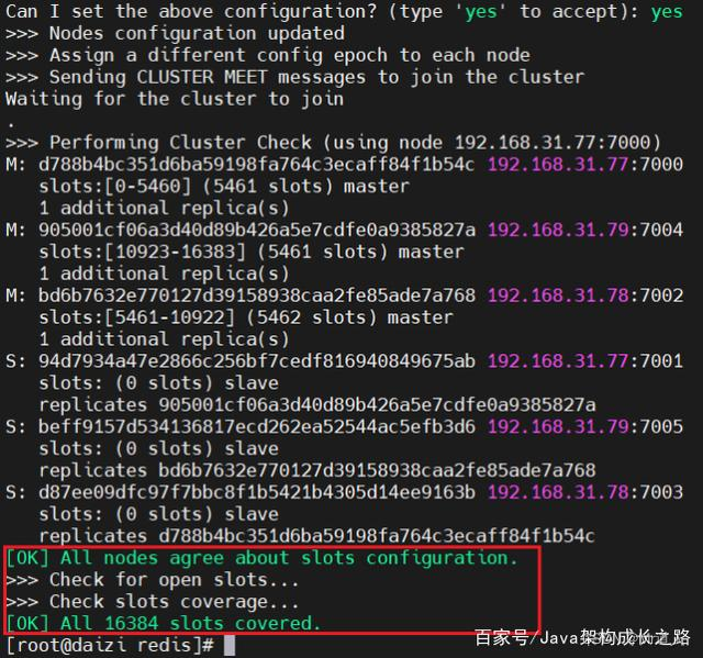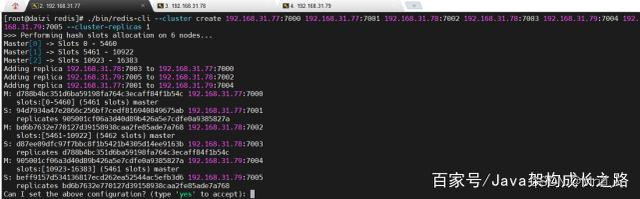 可以看到创建的集群信息,包括master节点及其哈希槽信息、slave节点信息。输入“yes”确认信息,即可看到集群创建成功: