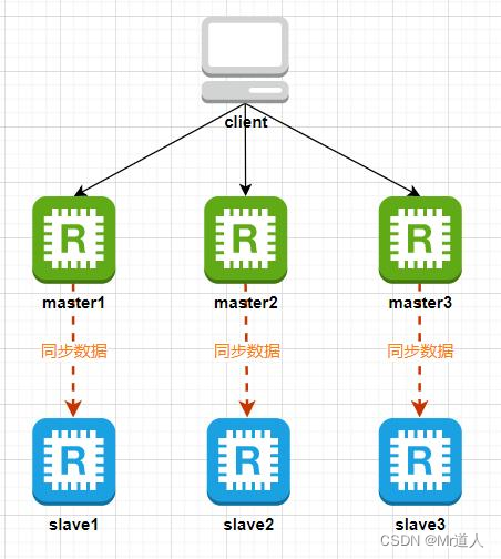 为了保证集群的高可用,每个master节点下面还需要添加至少1个slave节点,这样当某个master节点发生故障后,可以从它的slave节点中选举一个作为新的master节点继续提供服务。不过当某个master节点和它下面所有的slave节点都发生故障时,整个集群就不可用了。这样就组成了下图中的结构模式: