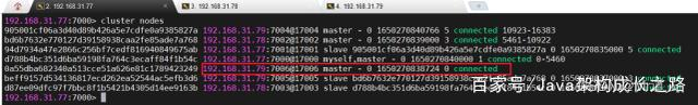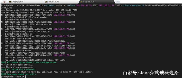 其中,--slave表示添加的是slave节点,192.168.31.79:7007是要添加的新节点,192.168.31.77:7000是集群中任意一个节点,--cluster-master-id后面跟的是新的slave节点要添加到哪个master节点下面,此处,我们将新的slave节点添加到192.168.31.79:7006这台master节点下。执行结果如下: