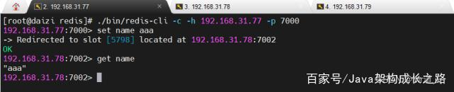 可以看到,当我们执行“set name aaa”的时候,自动重定向到了192.168.31.78:7002这台Redis实例中执行,而且也可以正常获取数据。