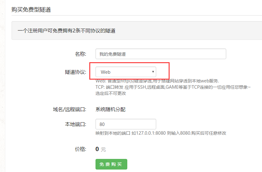 根据需要选择隧道协议,这里以web演示,购买隧道