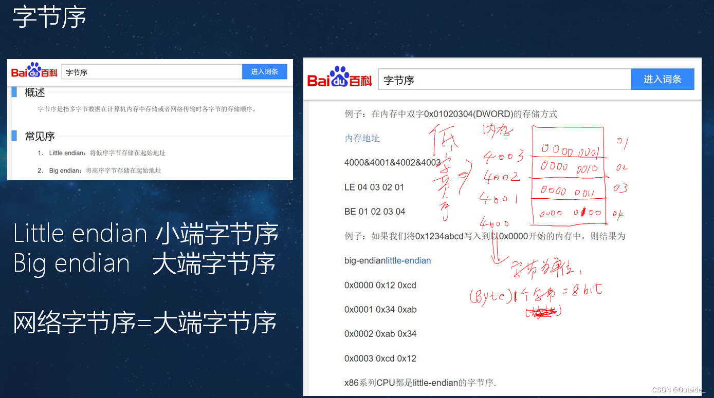 - 字节序是指不同的CPU访问内存中的多字节数据时候,存在大小端的问题