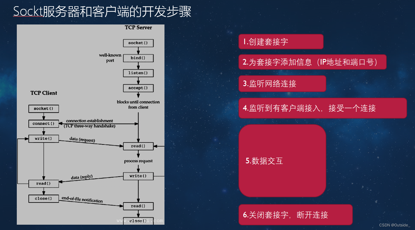 - 1.流式套接字(SOCK_STREAM)。唯一对应 TCP 提供了一个面向连接,可靠的数据传输服务,数据无差错,无重复的发送顺序接收。内射击流量控制,避免数据流淹没慢的接收方。数据被看作式字节流,无长度限制。