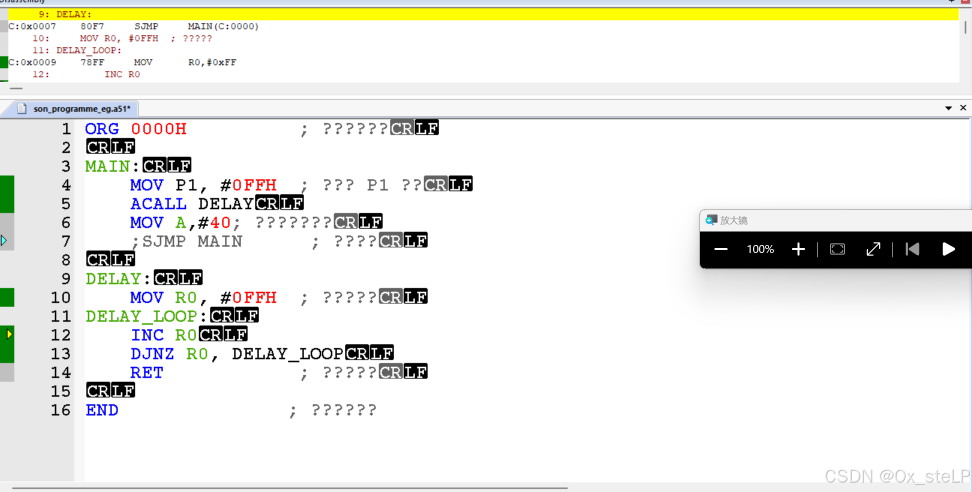 原理:在ACALL调用语句生效之后,将PC值压栈至SP寄存器,当RET被执行之后,PC值出栈,指向主函数。