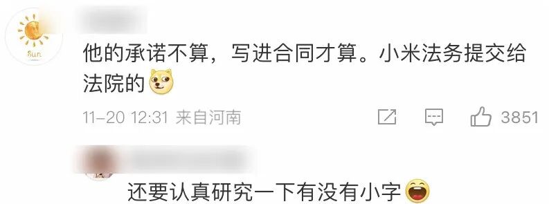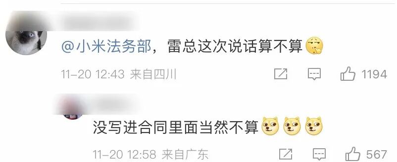 还有网友@ 小米法务部,问雷总这次承诺算不算数。