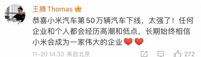 就连之前因泄密被开除的高管王腾也留言:“恭喜小米汽车第50万辆汽车下线,太强了!任何企业和个人都会经历高潮和低点,长期始终相信小米会成为一家伟大的企业[心]”