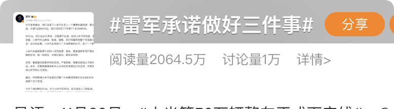 昨天(20日)雷总又上热搜了:这回是雷总承诺做好 3 件事。