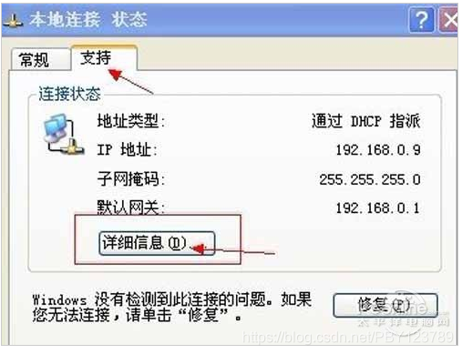 将鼠标放置在如上图所示的网络标注中,双击鼠标左键,会弹出“本地连接状态”界面,之后在本地连接状态框中切换到支持项,然后选择详细信息如下图: