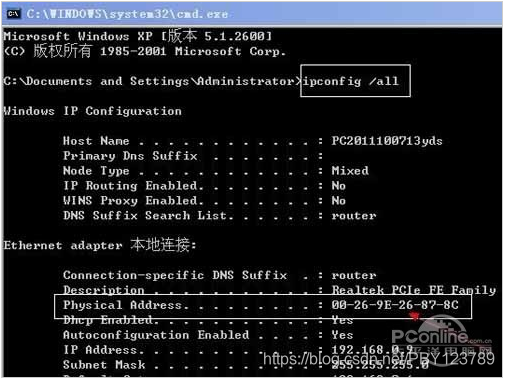 | 每块网卡都有一个特定的MAC地址,该地址是由网卡物理地址,是唯一的,因此在很多对网络安全很高的场合通常采用MAC地址作为识别一台电脑的标注,在路由器高级应用中可以在路由器中绑定指定电脑mac地址,从而实现某些指定的电脑可以实现上网,大大加强了网络安全,在无线路由器使用中应用尤其广泛,前提是需要知道所需要绑定电脑的mac地址,那么如何查看mac地址呢?下面详细介绍下mac地址查询教程。 mac地址查询方法有多种,以下为大家介绍几种最简单常用的方法: 方法一:使用ipconfig命令轻松查询电脑mac地址 进入电脑桌面,从左下角的开始→运行,在运行命令框中输入cmd命令,之后回车进入cmd命令操作界面,在里面输入ipconfig /all回车即可看到网卡与本地IP等诸多网络设备相信信息,其中Physical Address名称后面显示的就是mac地址,如下图: