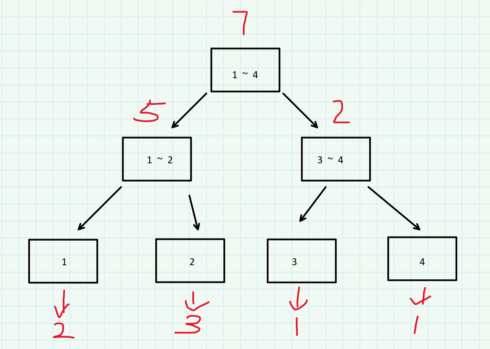 else return find(l, mid, o << 1, x, mid) + find(mid + 1, r, o << 1 | 1, mid + 1, y);