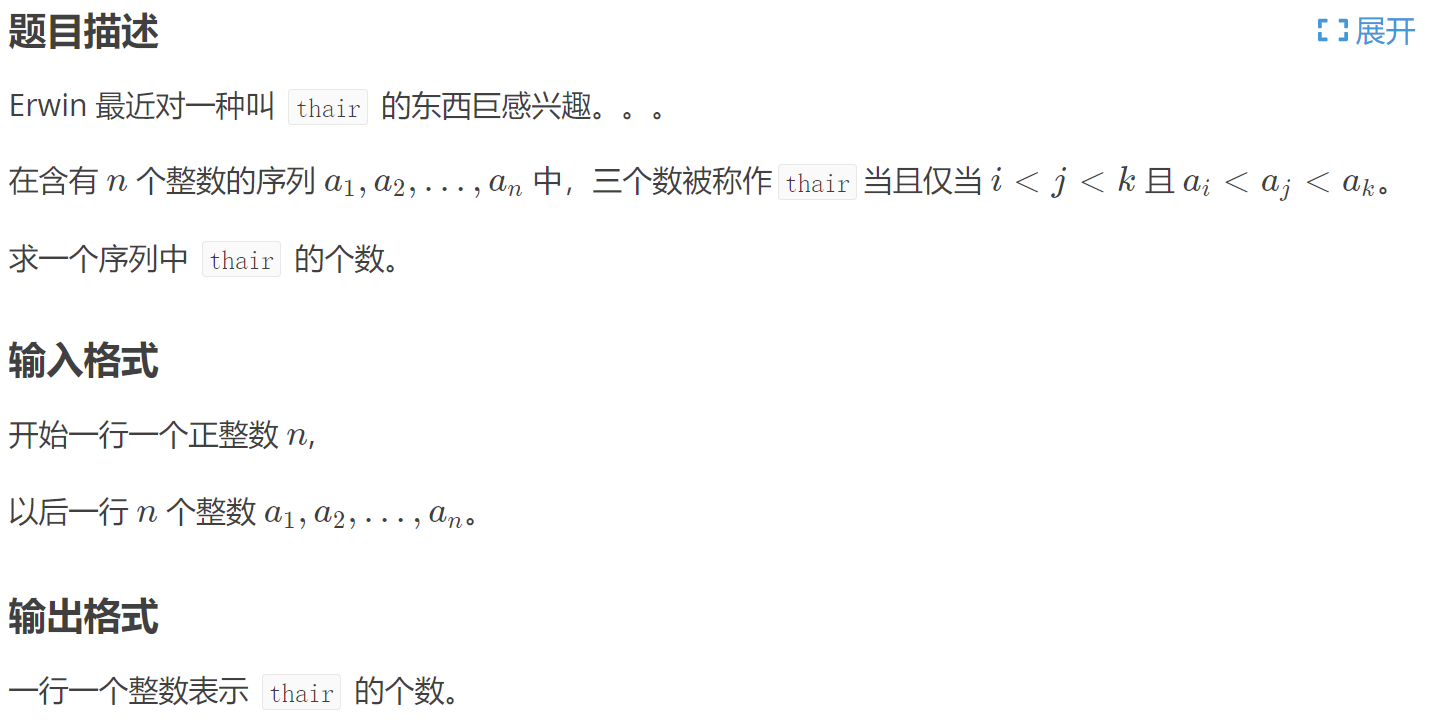 权值线段树正反动态加点两次,记录small[i],big[i],即第i个数之前有几个比它小,有几个比他大,统计答案ans += small[i] * big[i]