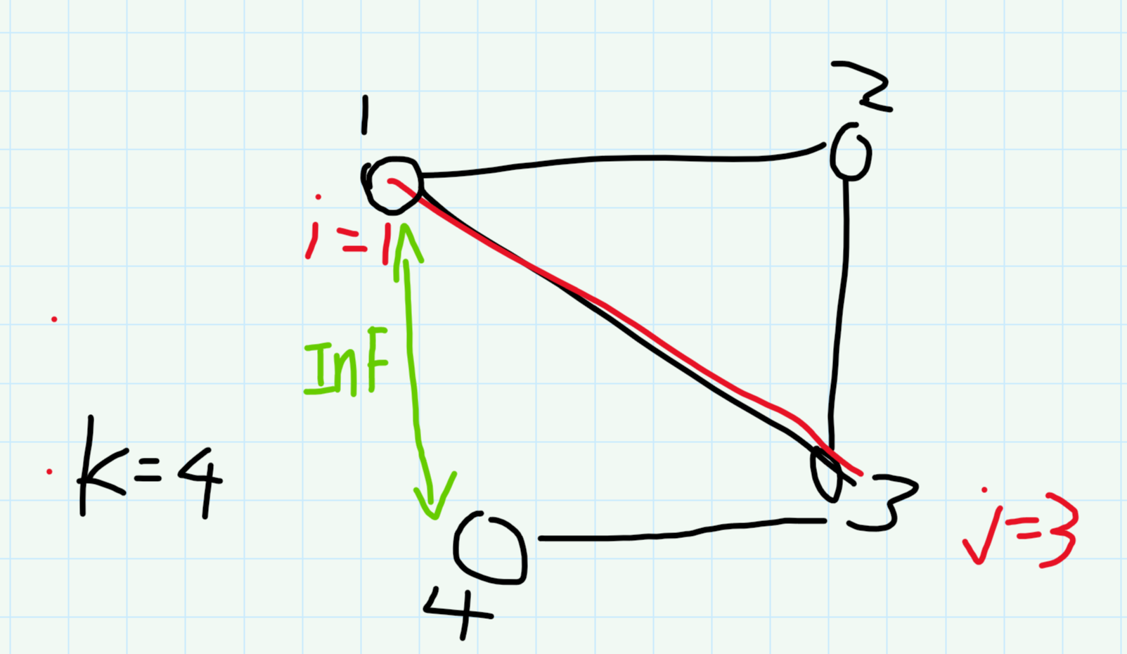 在上图,k = 3 时会产生dis[1][2] + val[1][3] + val[3][2] 的成功更新,而k = 4 时则不会