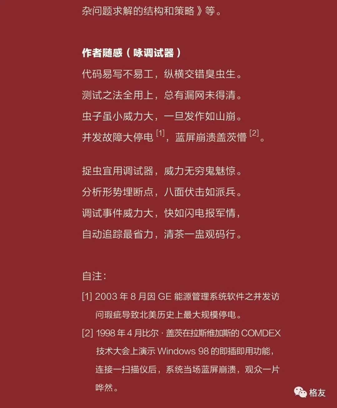 做了20多年的码农,我是不会写诗的。但是在最近几本书的领口位置,我都附了一些不能算作诗的句子。以前是写自己的经历和爱好,在卷2的领口,写的是调试器。我想用浅显而且简短的语言赞美这个伟大的工具。
