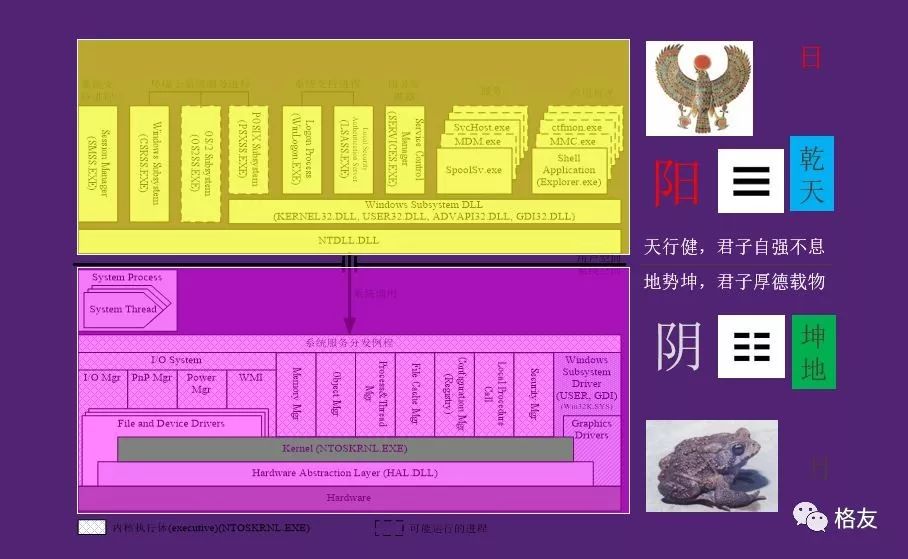 横向多个虚拟空间是为了支持多任务,让每个任务都有自己独立的活动空间。上下两个阶层是为了把公共的系统基础设施和管理任务独立出来。可以把任务想象成现实社会中的公民,内核想象成政府。