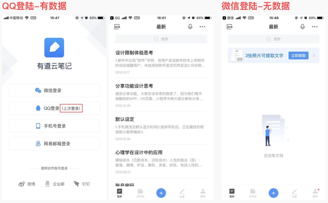 「有道云笔记」的登录界面会帮助用户记录上一次登录的账号信息,并在下一次登陆到时候告知用户,减轻用户的记忆负担,功能虽小但体验很好。因为过了很长时间再重新登陆时,很难记起上次是用哪一种方式(账号)登陆的,况且很多产品的数据体系没有打通,不同账号之间的数据不能互通,导致账号不同,里面的数据就不同,这样会给用户造成疑惑与焦虑感,体验真的很差。