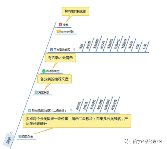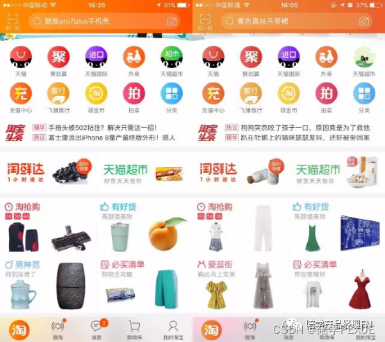 1.搜索,淘宝把搜索二级页面关键词直接展示在一级搜索位置下方,相当于关键词搜索功能层级上升;