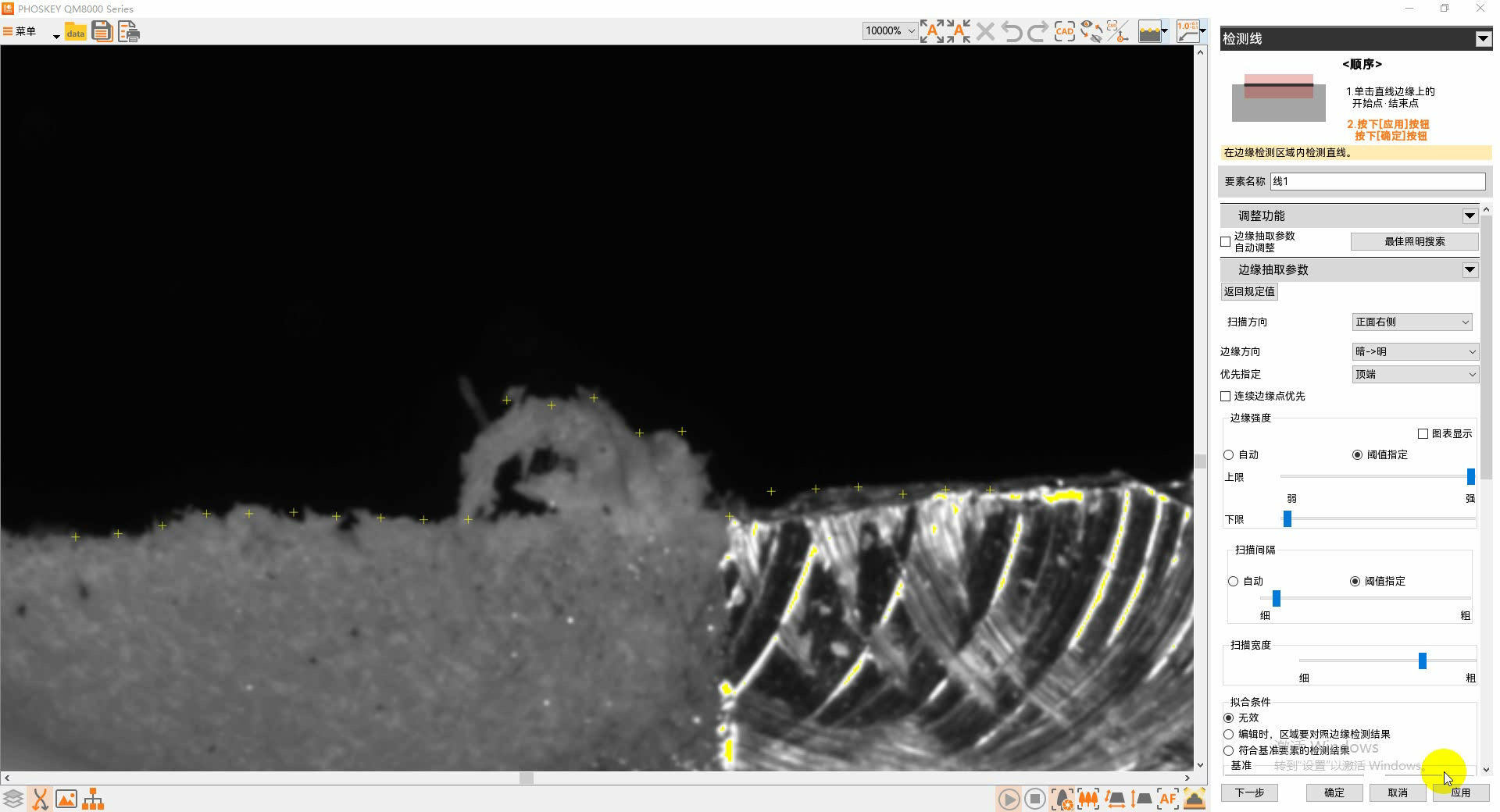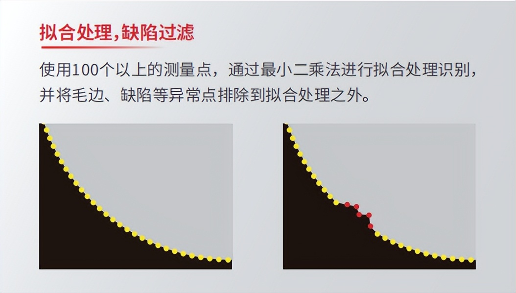 QM系列闪测仪内置最小二乘法回归处理算法,可自动祛除毛刺和异常点。对特征位置的影响降至最低。该算法通过拟合处理,提取100个以上的测量边缘点,进行拟合,识别线、圆、圆弧等特征,从而排除毛边和缺陷对测量结果的影响。