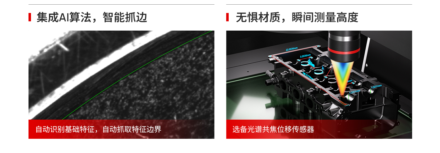 闪测仪提供高效的二维尺寸测量能力,而光谱共焦传感器可补充其难以实现的高精度轴向位移(如段差、厚度)及复杂曲面形貌的测量需求。