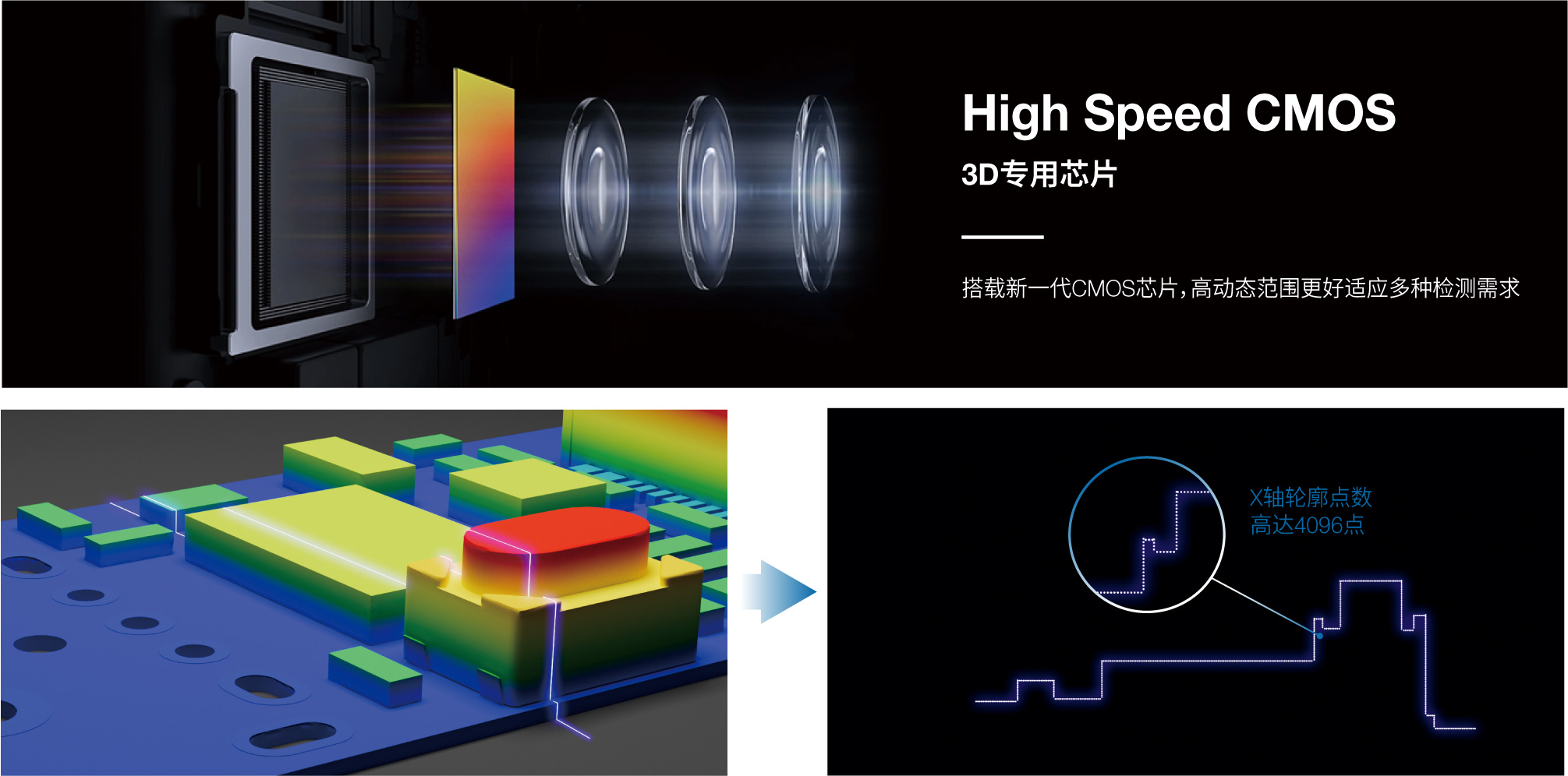 最高X轴、Y轴重复精度高达0.3μm,线性精度达±0.02% of F.S.,实现速度与精度双飙升,告别扫描缓慢,微小瑕疵无处遁形,为行业用户带来全新3D测量体验。单轮廓点数为4096点,运用高速数据传输和异构式数据处理机制,确保相机与计算机间的高效数据交换和实时控制,提升了相机处理海量图像数据的性能。采样速度全画幅可达4KHz,最高49KHz,在高速生产环境中迅速准确响应。同时结合3D视觉算法和高效处理器,支持点云重建、图像配准、形状识别和缺陷检测等关键功能,对捕获的图像数据进行即时处理与分析,实现高速精确的三维测量和分析。