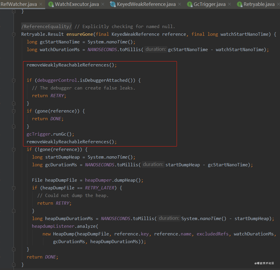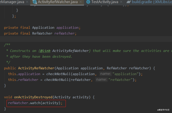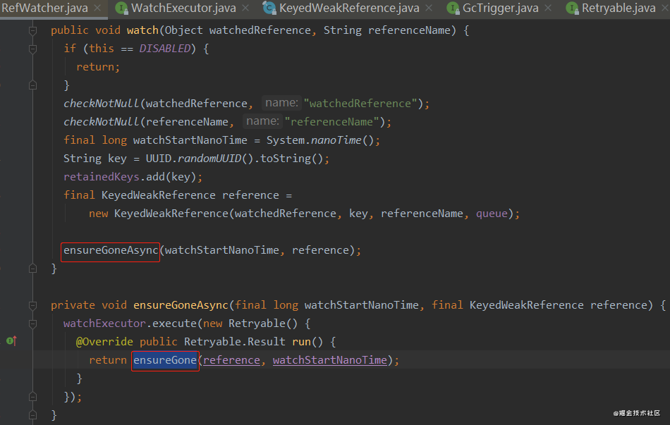 发现入口在RefWatcher.watch方法里,这个RefWatcher是核心类,跟进去watch方法。