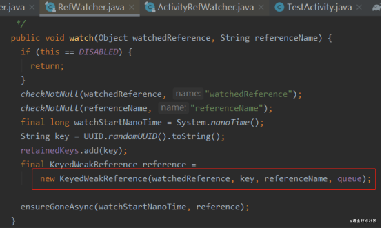 使用randomUUID生成一个随机数key,并加到了一个set中,这个key跟当前监控的activity是一一对应的,这个很关键,watchedReference就是当前关闭的activity对象,然后包装成KeyedWeakReference对象,KeyedWeakReference继承了WeakReference。