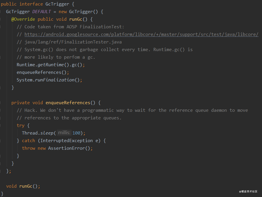 简单来说就是,作者从AOSP那里Ctrl+c来了一段代码,因为System.gc()不能保证每次gc而Runtime.gc()会相对更可靠。