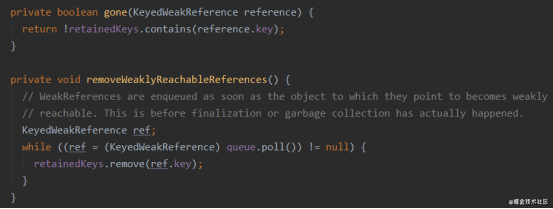 removeWeaklyReachableReferences方法里就是遍历把引用队列queue里的对象,在retainsKeys这个set里面移除掉。