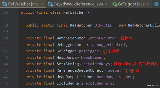 就是上面watch方法的watchedReference(就是那个被监测的activity)被KeyedWeakReference弱引用持有了,当activity被回收了,RefWatcher#queue里面就会有这个KeyedWeakReference。