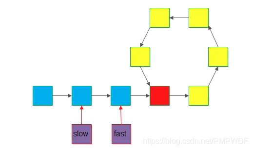 使用快慢两个指针,fast指针一次走2步,slow指针一次走一步,看图二