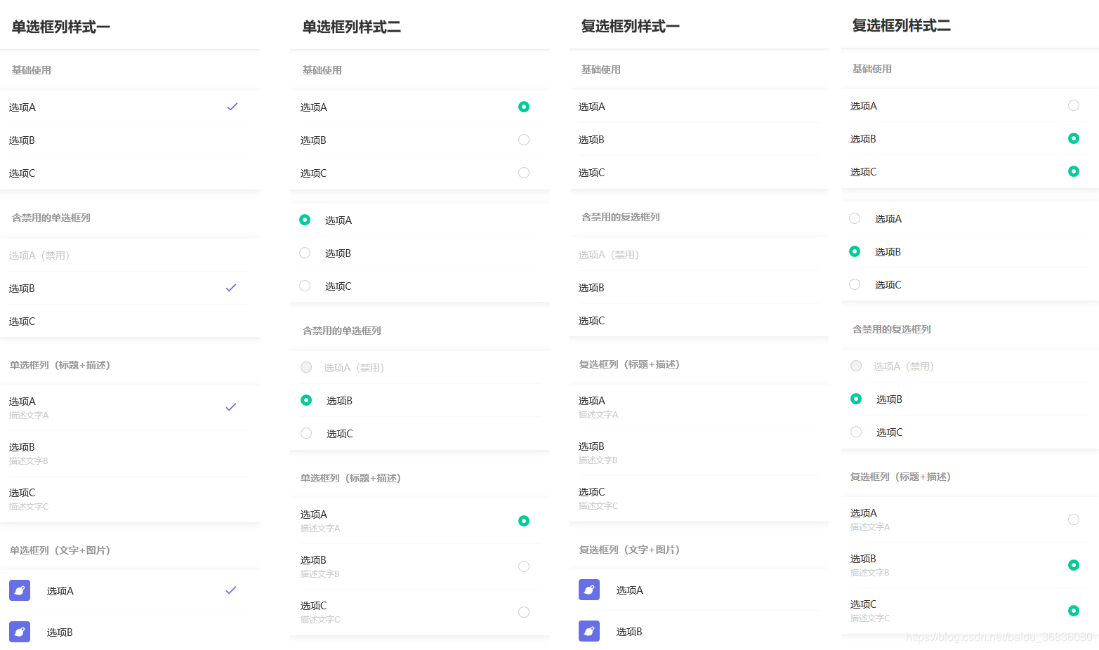 移动端高保真动态交互元件库:单选框列样式/复选框列样式