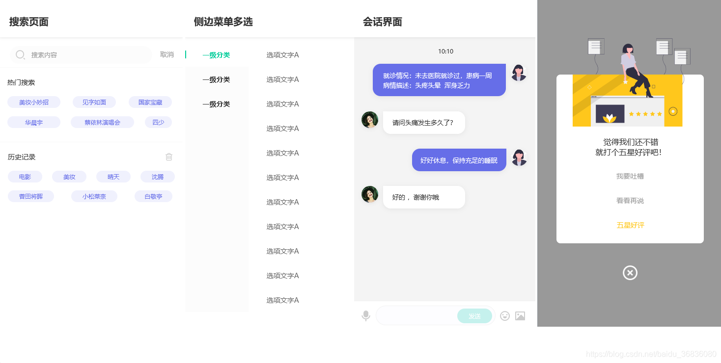 搜索页面/侧边菜单多选/会话界面/评分提醒