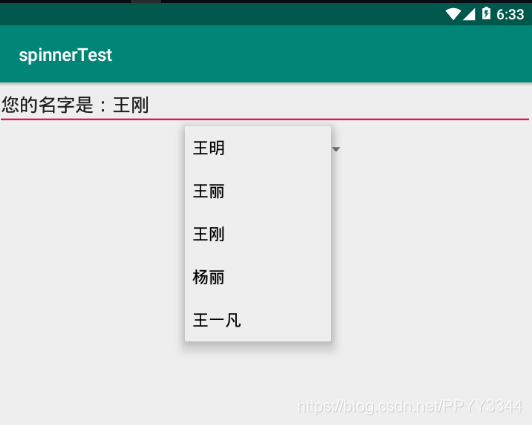 package com.rfstar.spinnertest; import androidx.appcompat.app.AppCompatActivity; import android.os.Bundle; import android.view.View; import android.widget.AdapterView; import android.widget.EditText; import android.widget.Spinner; public class MainActivity extends AppCompatActivity implements AdapterView.OnItemSelectedListener { EditText editText; Spinner spinner; @Override protected void onCreate(Bundle savedInstanceState) { super.onCreate(savedInstanceState); setContentView(R.layout.activity_main); editText=(EditText)findViewById(R.id.edit); spinner=(Spinner)findViewById(R.id.spinnerClick); spinner.setOnItemSelectedListener(this); } @Override public void onItemSelected(AdapterView<?> parent, View view, int i, long l) { String value=parent.getItemAtPosition(i).toString(); editText.setText("您的名字是:"+value); } @Override public void onNothingSelected(AdapterView<?> parent) { } }特殊的是,它有两个实现方法,前者是选中某个条目之后的处理方法,后者是没有任何条目被选中的处理方法。当选中某条时,让它显示到 EditText 中。