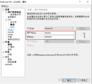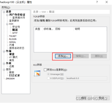 我们要在五台云服务器中选择一台作为隧道机,比如,我们选择hadoop100作为隧道机,那我们我们在Xshell的属性中选择“隧道”并选择“添加”,如下所示。