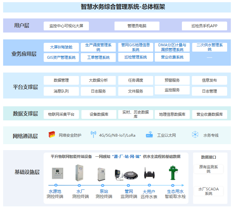 集生产调度、管网GIS、分区计量、二供管理、运维管理、资产管理、营收服务等系统于一体,覆盖供水各部门日常管理工作