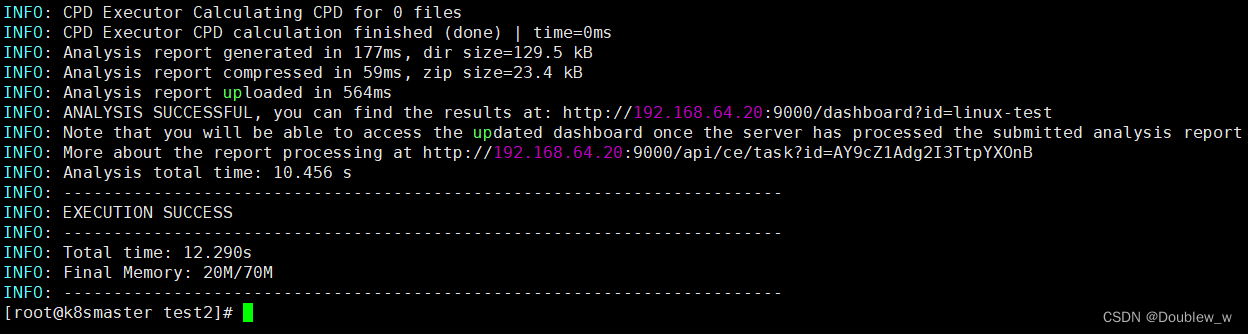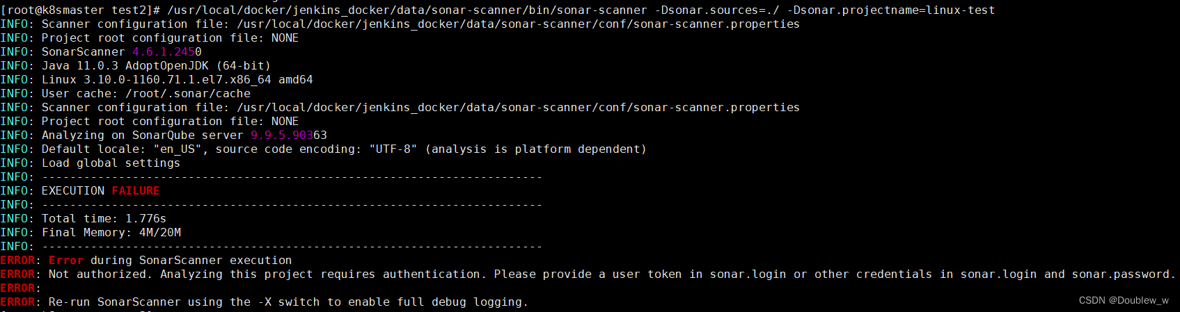 [root@k8smaster test2]# /usr/local/docker/jenkins_docker/data/sonar-scanner/bin/sonar-scanner -Dsonar.sources=./ -Dsonar.projectname=linux-test -Dsonar.java.binaries=./target/ -Dsonar.projectKey=linux-test -Dsonar.login=sqa_a7c4677e09792005ff62cae13f6fab1ea9f169e5