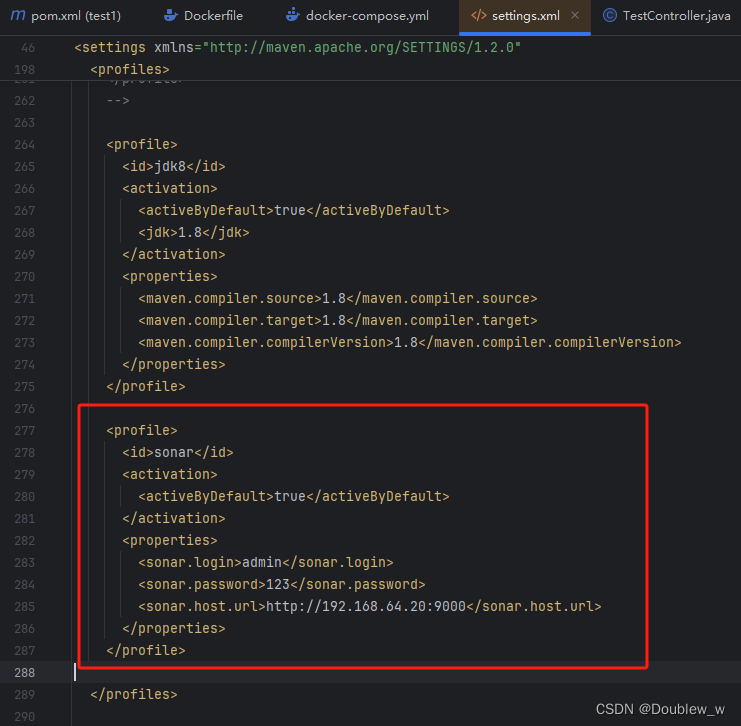 <!--加上下面的内容(指定sonar的默认开启。登录地址,用户名和密码)-->