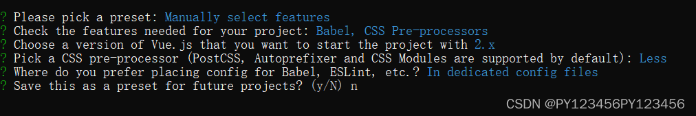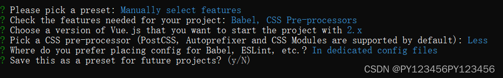 接下来选择是否保存刚才所选的配置,如果输入Y保存的话下次再创建同类的项目就不用一步一步来配置了,直接选择保存的预设就可以直接创建项目了。这里选Y选N都可以。