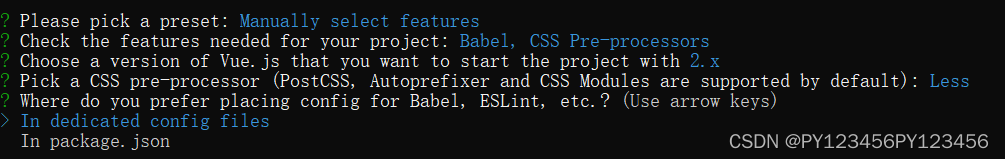 接下来选择Babel,eslint这些插件的配置文件放到一个独立的配置文件还是放到pakage.json里面。这里选择放到独立的配置文件中,不要放到pakage.json里面。