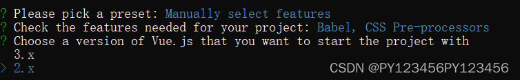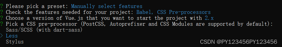接下来选择预设,这里只选择Babel和css预处理器就好,Router和Linter/Formatter等后面学了再选。Linter/Formatter是来约束代码风格的。(这里空格键来控制选中,enter键进入下一步)