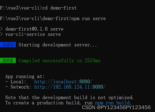 下面根据提示把项目跑起来,先进入项目的根目录(cd 到你创建的vue项目的名称),然后npm run serve把项目跑起来,如图所示: